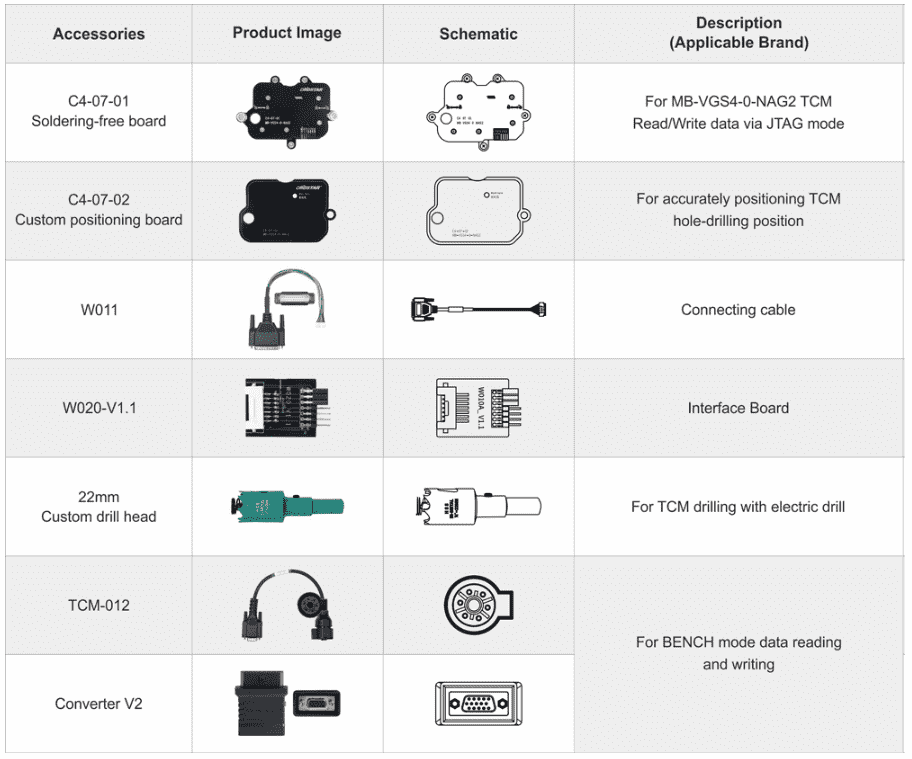 Designed for drilling access to the FBS4 7G-Tronic VGS4-0-NAG2 Transmission Control Module (TCM), OBDSTAR C4-07 (MB-VGS4-0-NAG2) adapter kit supports solder-free virginizing of used TCM via JTAG mode. It also supports personalization (data transfer) via BENCH or OBD mode, achieving the same effect as ECU clone. This eliminates the requirement for automotive electronics technicians to have advanced soldering skills, making it a powerful tool for professionals in the field.