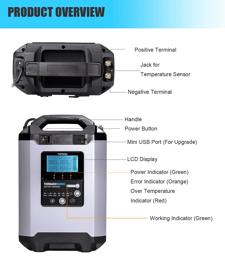 Tornado 90000 serves as a smart battery charger for all types of 12V/24V lead-acid batteries, including Wet, Gel, MF, Cal, EFB, and AGM from 20Ah to 2800Ah(150 CCA and Up). It can not only start ordinary cars and SUVs, but also large vehicles that require high starting current, such as trucks, tractors, construction machinery, and even diesel vehicles and ships.