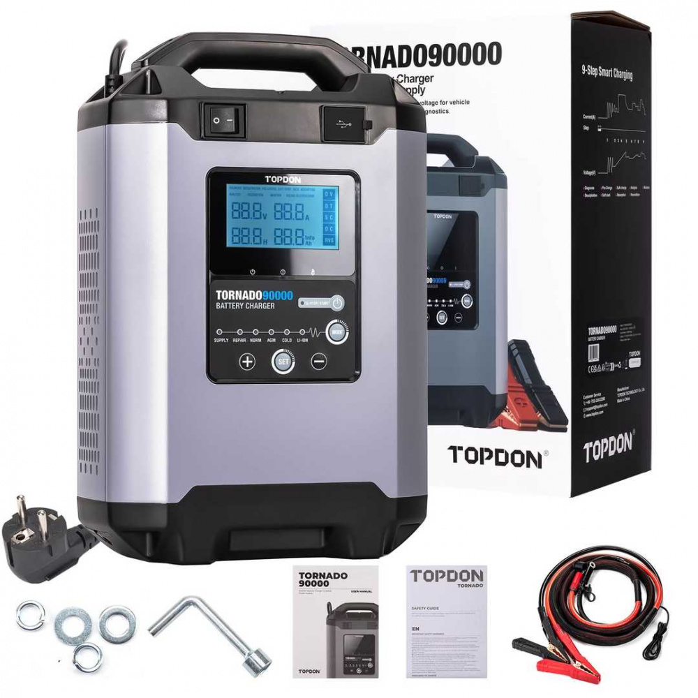 Tornado 90000 serves as a smart battery charger for all types of 12V/24V lead-acid batteries, including Wet, Gel, MF, Cal, EFB, and AGM from 20Ah to 2800Ah(150 CCA and Up). It can not only start ordinary cars and SUVs, but also large vehicles that require high starting current, such as trucks, tractors, construction machinery, and even diesel vehicles and ships.